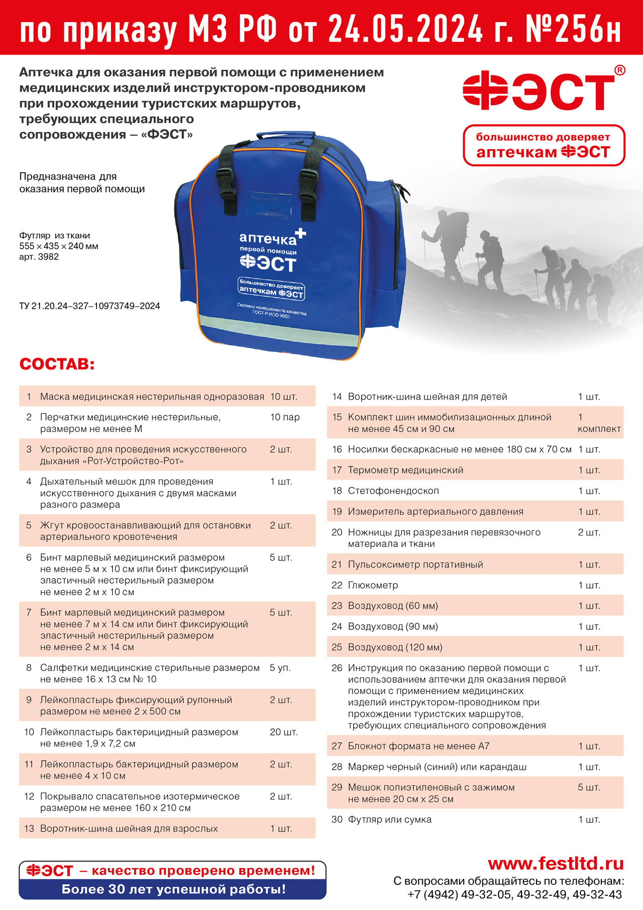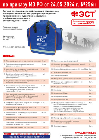 Аптечка для оказания первой помощи с применением медицинских изделий инструктором-проводником при прохождении туристских маршрутов, требующих специального сопровождения (приказ №256н) "ФЭСТ" изготовлена в соответствии с приказом Министерства здравоохранения Российской Федерации от 24.05.2024 г. №256н по ТУ ТУ 21.20.24–327–10973749–2024.