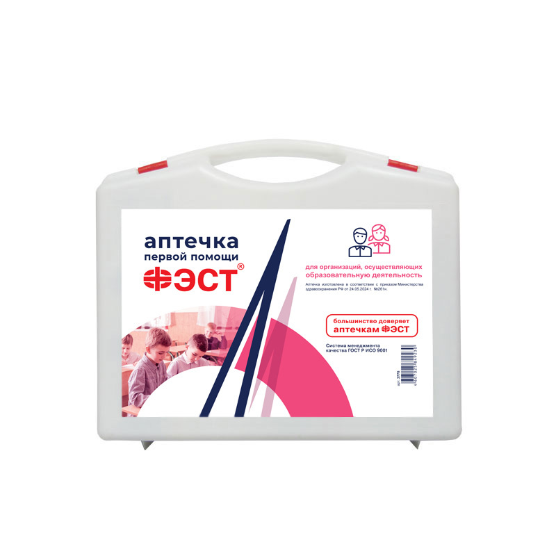 Аптечка для оказания первой помощи с применением медицинских изделий в организациях, осуществляющих образовательную деятельность "ФЭСТ" изготовлена в соответствии с приказом Министерства Здравоохранения РФ от 24.05.2024 г. №261н по ТУ 21.20.24–322–10973749–2024.