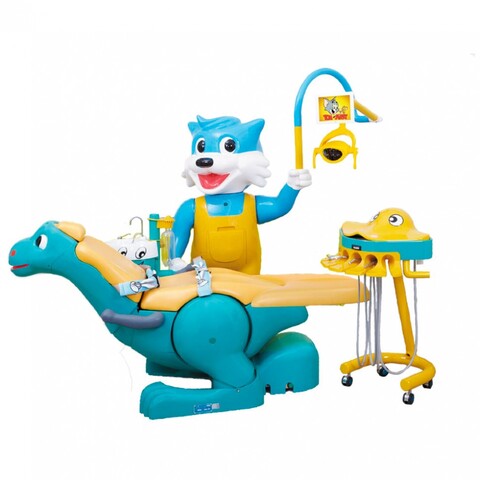 Детская стоматологическая установка APPOLLO V (кот, динозавр) предназначена для осмотра и лечения маленьких пациентов. Кресло установки изготовлено в виде яркого желто-зеленого динозавра. Врачебный блок замаскирован под большую игрушку в виде кота.