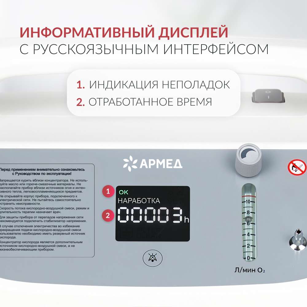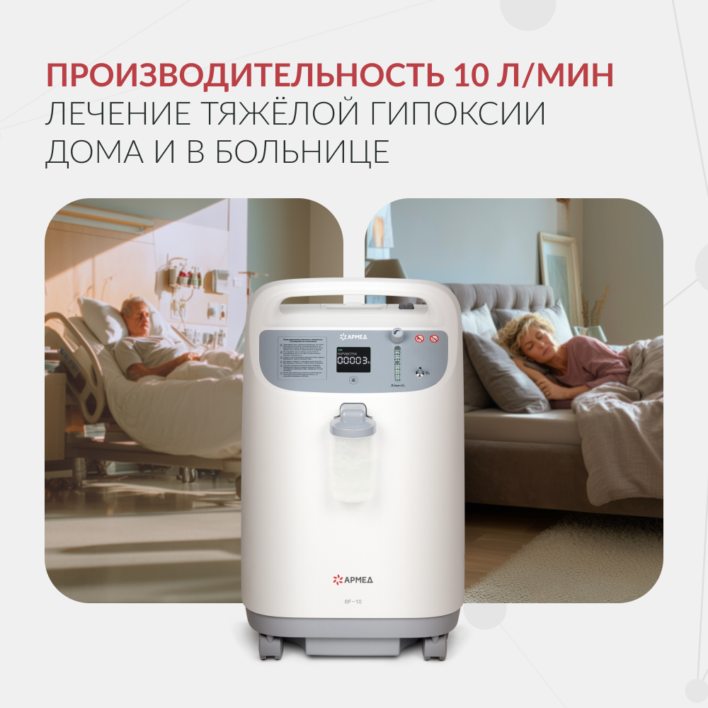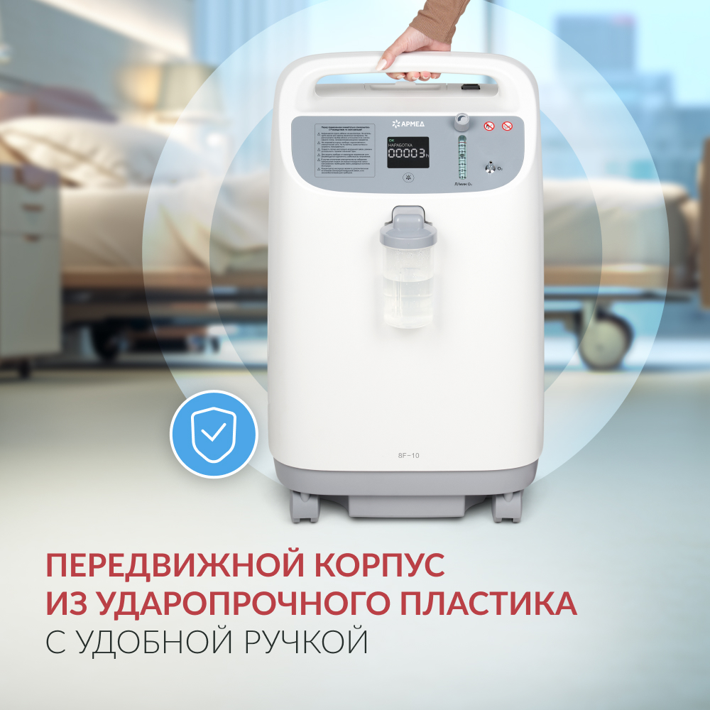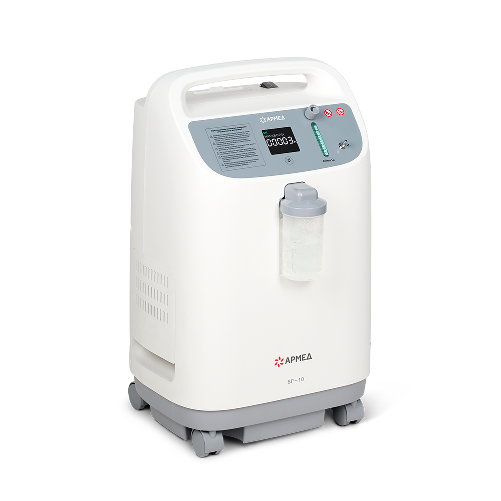 Концентратор кислорода Армед 8F-10L - cовременный концентратор кислорода с высокой производительностью, позволяющий проводить кислородотерапию у тяжелобольных пациентов как в медучреждении, так и в домашних условиях. Мощная и безопасная передвижная модель с полной комплектацией и простым управлением.