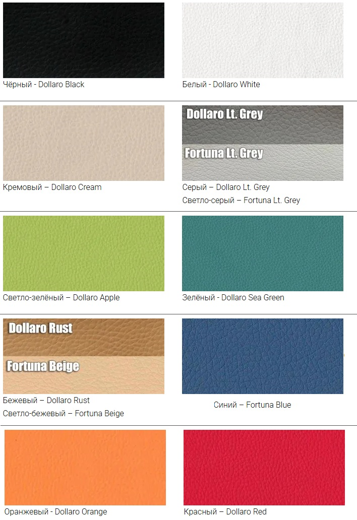 - Обивка экокожи: кремовый, чёрный, белый, бежевый, светло-зелёный, зеленый, синий, светло-серый, серый, оранжевый, красный