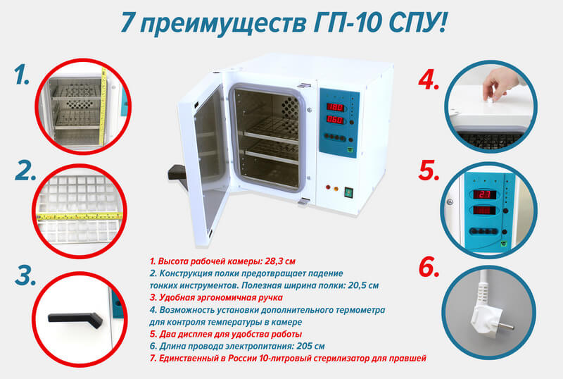 Стерилизатор ГП-10 СПУ предназначен для стерилизации сухим горячим воздухом изделий, изготовленных из термостойких материалов - хирургических инструментов, стеклянной посуды и других медицинских изделий. Сухожаровый шкаф ГП-10 СПУ может быть использован для дезинфекции и сушки медицинских и маникюрных инструментов.
