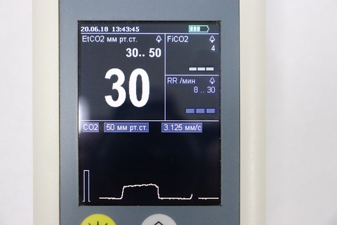 - Концентрация СО2 в конце выдоха (EtCO2) и в конце вдоха (FiCO2): диапазон измерения от 0 до 15 %V