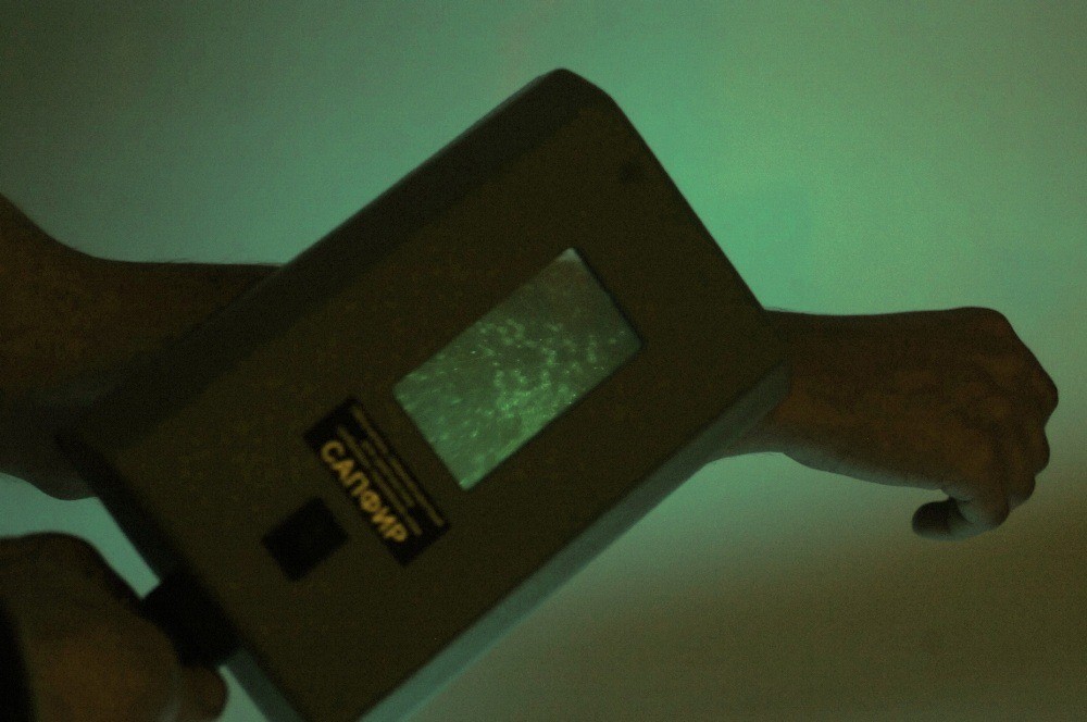 Диагностический осмотр с помощью облучателя «Сапфир» проводят при полном затемнении. Допустимый диапазон температур в помещении – +5…+45℃. Все присутствующие при диагностике должны надеть защитные очки.