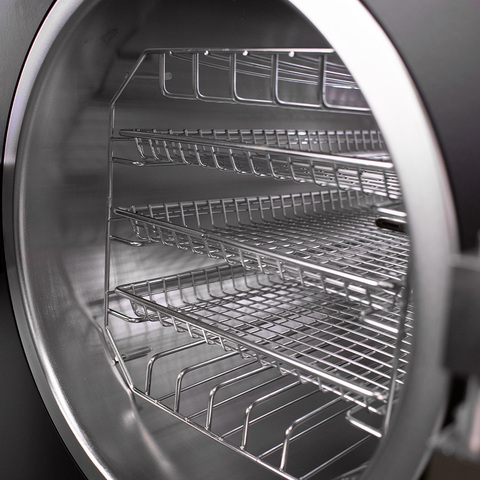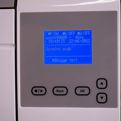 В автоклаве 7 заданных режимов стерилизации, отличающихся продолжительностью, кратностью вакуумирования, температурой и давлением. Часть параметров может регулироваться пользователем. Контролировать процесс позволяет удобный цифровой экран, на котором отображаются основные параметры. Есть возможность подключения принтера.