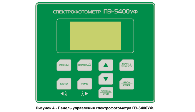 На панели управления спектрофотометра расположен жидкокристаллический графический индикатор и кнопки, с помощью которых производится управление работой прибора (рис. 4).