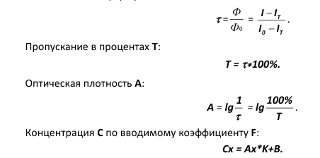 Коэффициент пропускания τ исследуемого раствора определяется как отношение потоков или сигналов по формулам:
