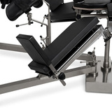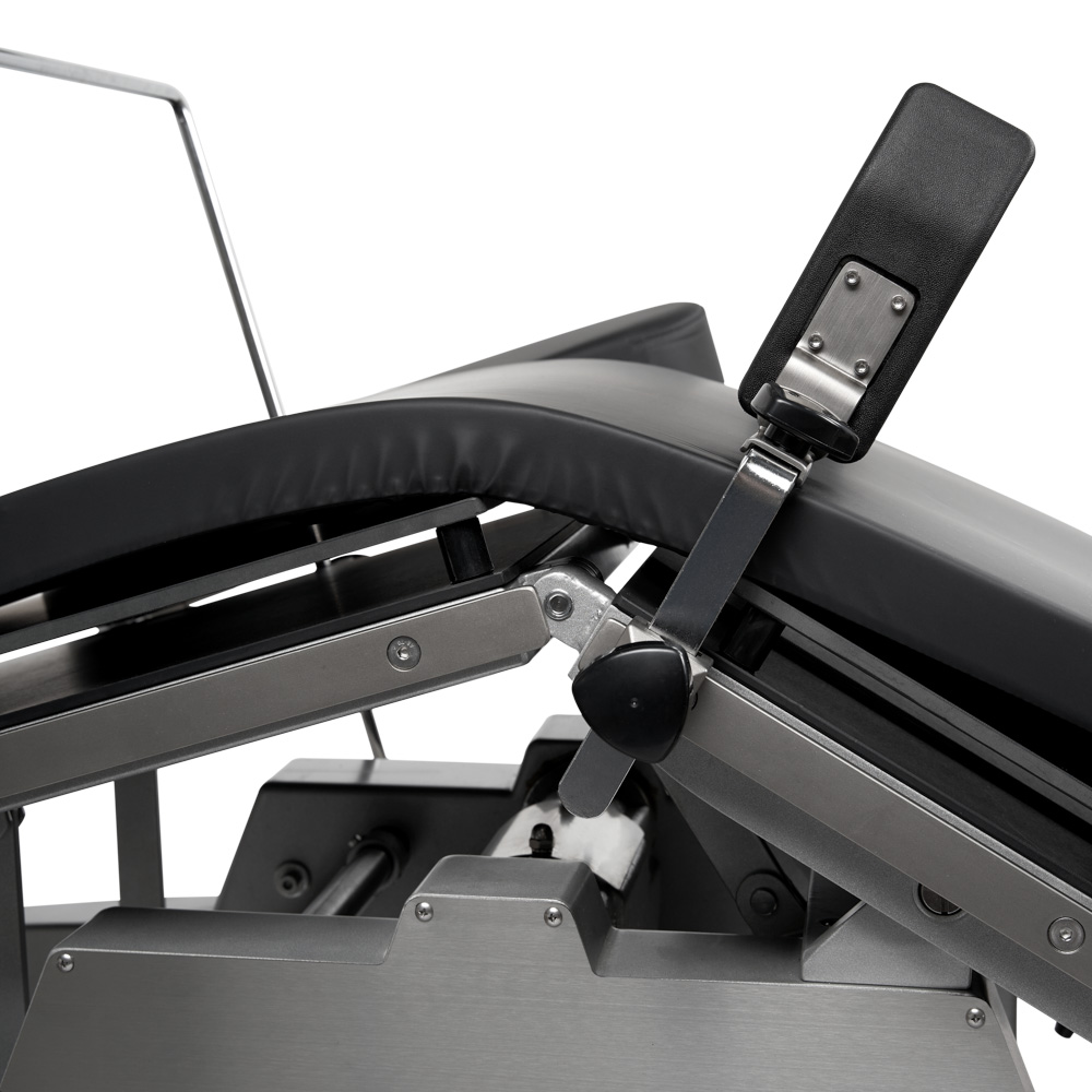 Тазобедренная секция оснащена настраиваемыми по высоте и положению относительно секции опорами для ног — благодаря шарнирной конструкции они вращаются вокруг своей оси. Для фиксации поясницы на тазобедренной секции стола предусмотрены мягкие регулируемые опоры.